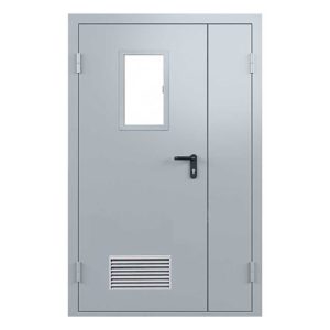 Остекление противопожарной двери выполнено из огнестойкого многослойного стекла толщиной 28 мм. В остальном конструкция аналогична конструкции глухой противопожарной двери: из стального листа толщиной 1,2 мм, с ватой из базальтового волокна и усиливающими ребрами внутри полотна и вдоль рамы. Покрытие — эпоксидное/полиэфирное порошковое покрытие, которое является антивандальным и устойчивым к коррозии.