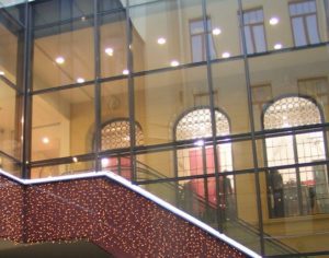 При разработке и реализации проектов с противопожарной конструкцией реализуются принципы функционального дизайна. Вставки из огнестойкого стекла ограничивают движение пламени и изолируют очаг возгорания. Пока нет опасности, витражи сохраняют свою эстетическую ценность.