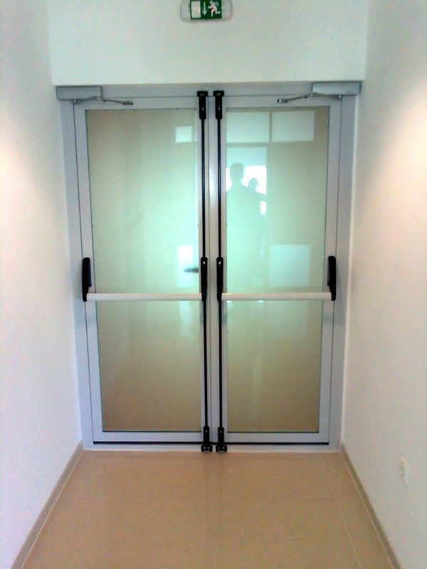 От качества заполнителя зависит, насколько эффективно преграда будет препятствовать распространению высоких температур. Материал должен быть негорючим и стойким к температурным воздействиям. В комплектацию противопожарной алюминиевой двери также входят уплотнители, ручки, замки и иные элементы фурнитуры. Дополнительные фурнитурные детали: доводчики, отбойные пластины, пороги разных типов.